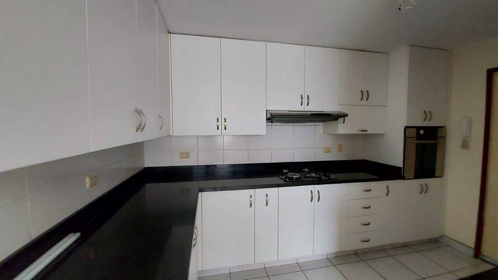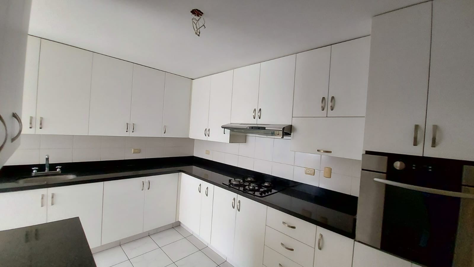 Una cocina con reposteros altos y bajos, tiene cocina empotrada y horno.