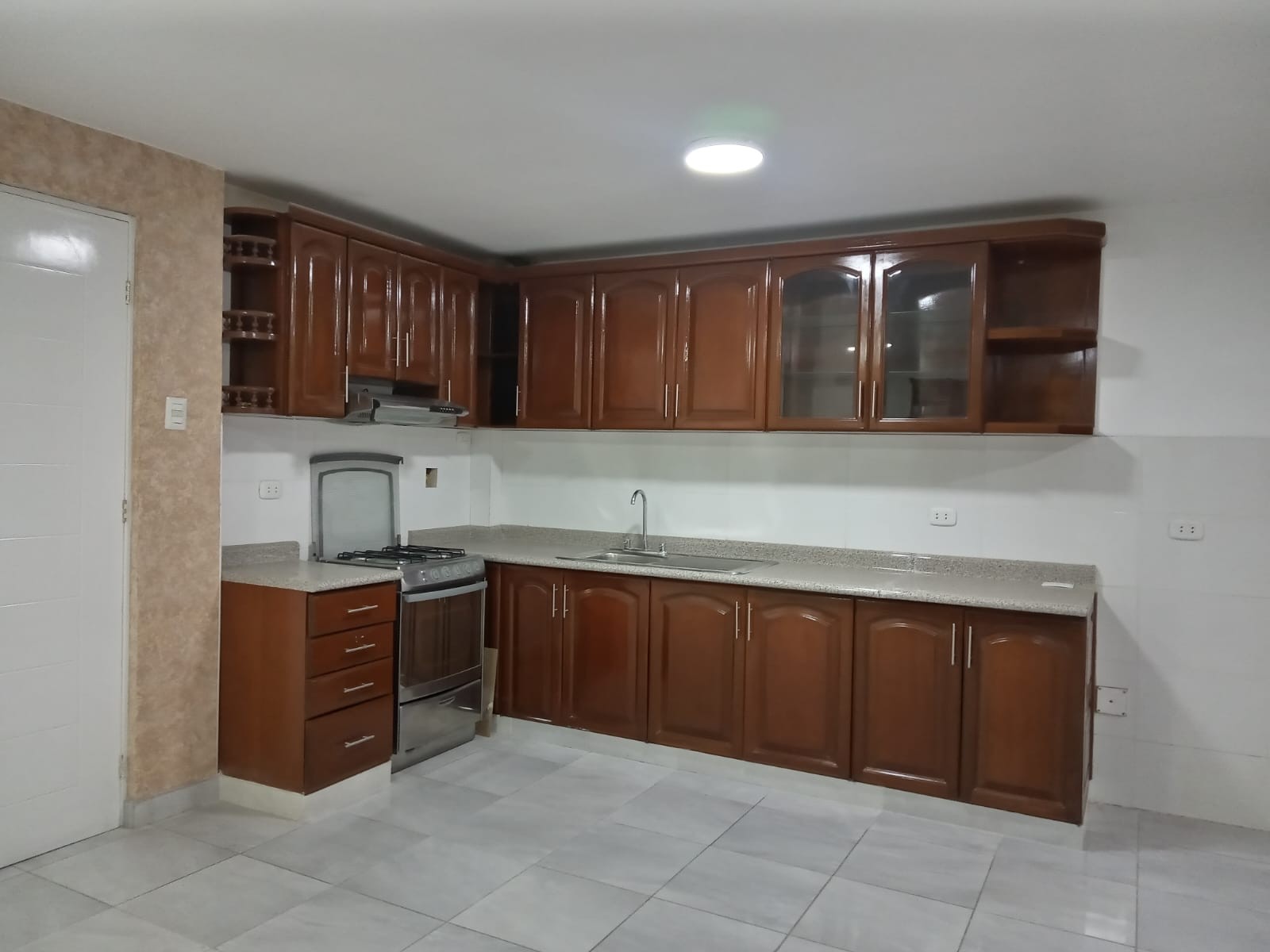 Área de 75m2, amplia sala comedor con piso de cerámico español, 2 habitaciones, 1 baño completo agua caliente inodoro one piece y ducha española. Cocina con instalación de gas Calidda, mesa de granito y reposteros altos y bajos en madera cedro. Lavandería y tendal. Vista al parque.