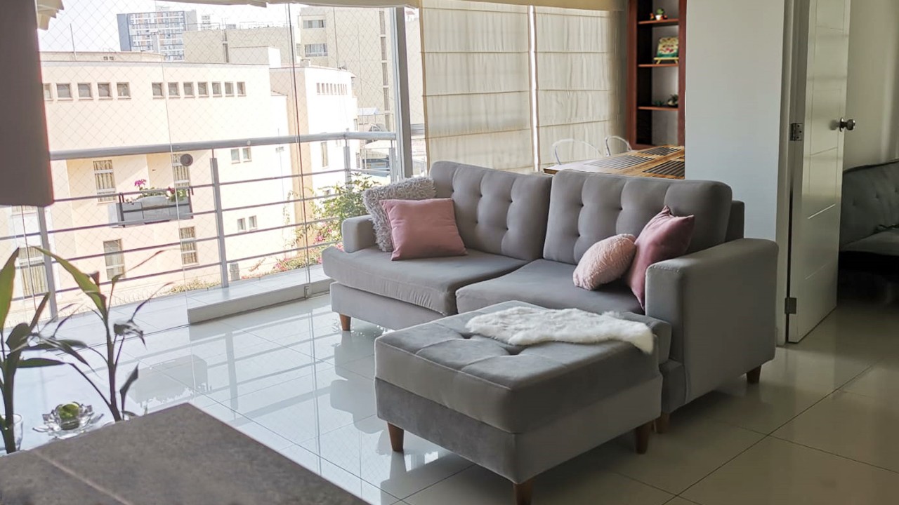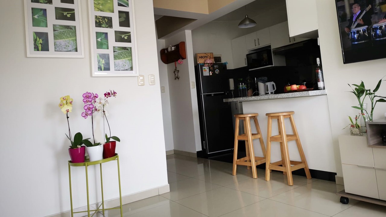 El departamento, con excelente distribución, es de 67.5 m2, tiene una sala con balcón (con espacio para dos sillas y mesita), comedor, cocina tipo americana.