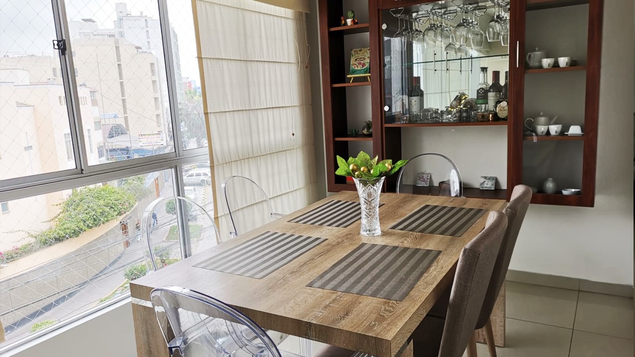 Se alquila Moderno Departamento AMOBLADO en 4 Piso con vista al exterior, situado en excelente zona residencial en Surquillo, Barrio Medico. La puerta posterior del edificio tiene salida directa a un parque en la Urb. Aurora Miraflores.