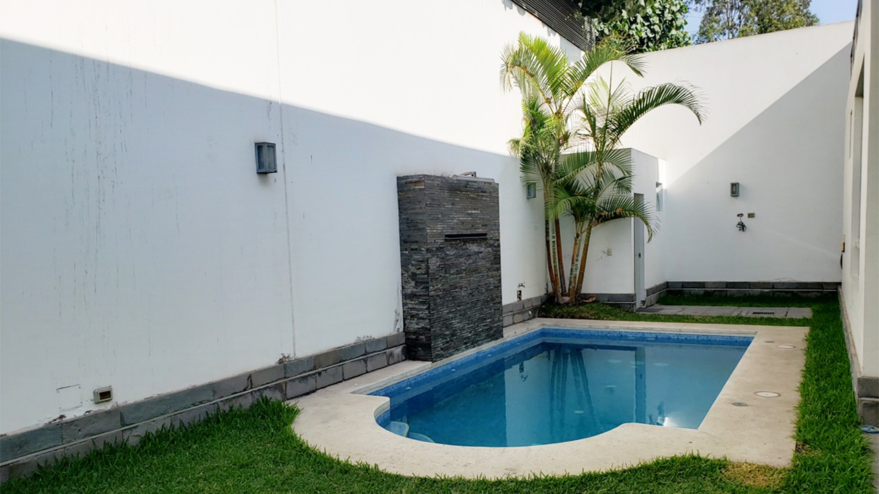 Patio trasero con piscina y baño.