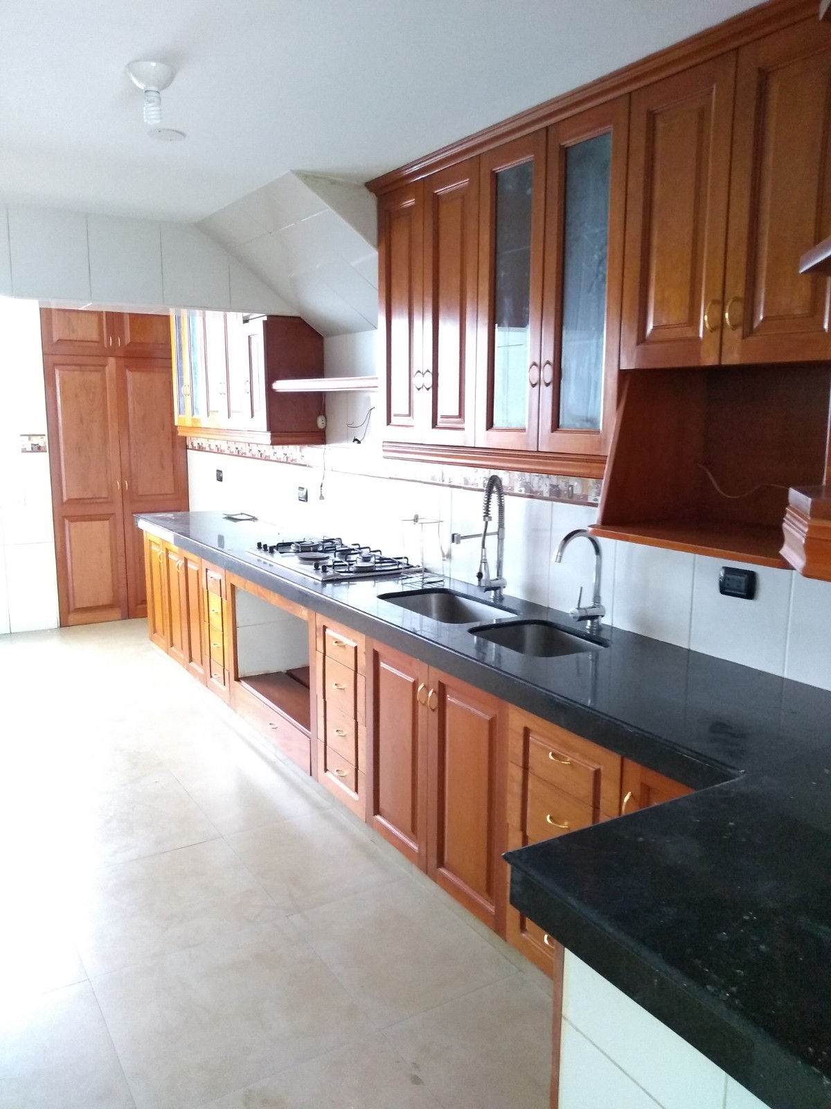 Gran cocina, con elegante tablero de granito oscuro, full amoblado, con reposteros altos y bajos de madera