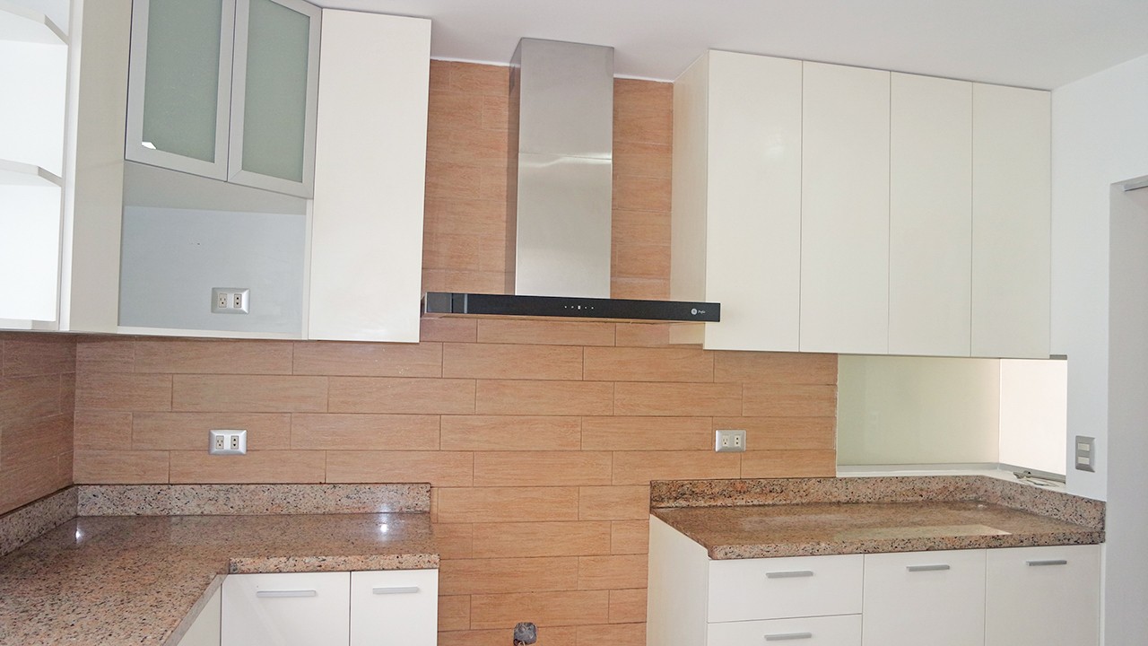 Amplia cocina con muebles altos y bajos.