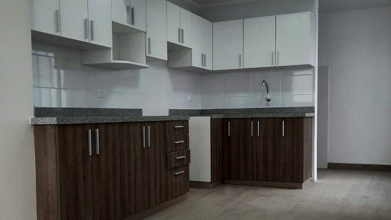 Cocina tipo kitchenet con reposteros altos y bajos.