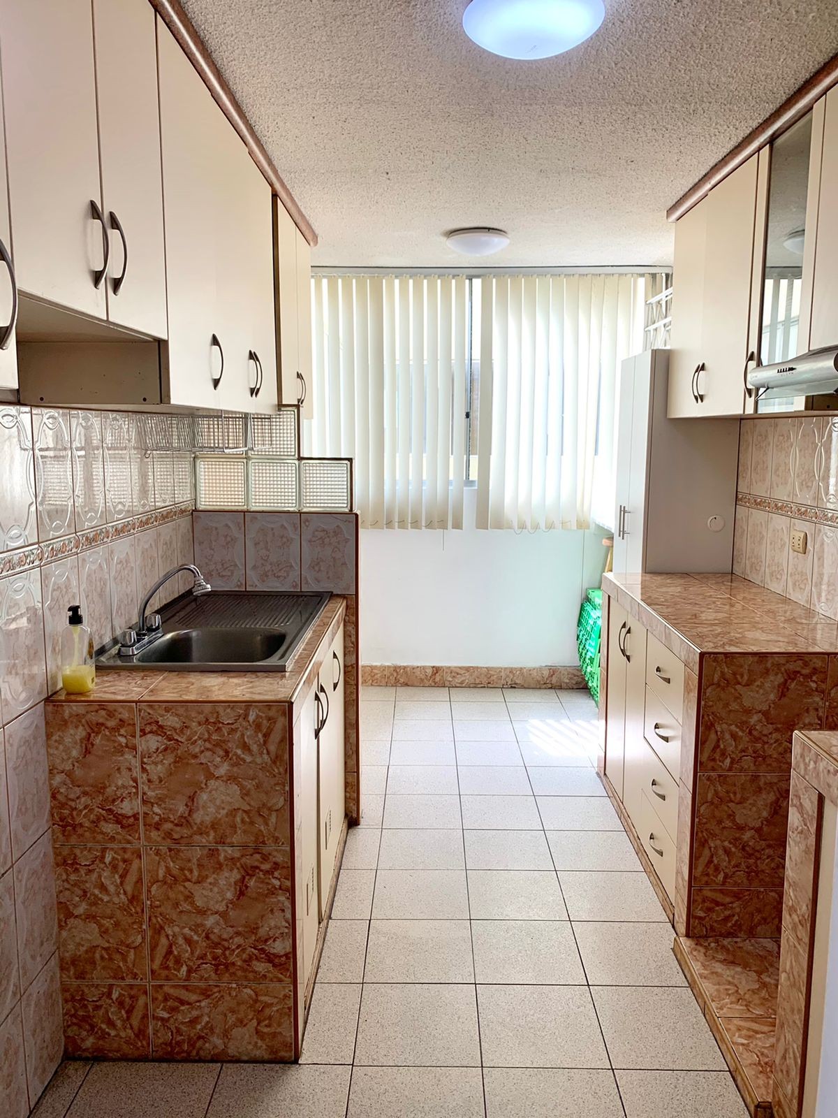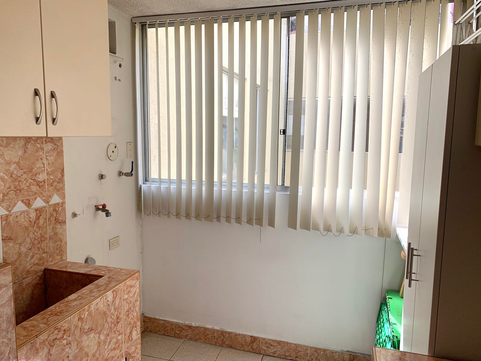 Cocina con reposteros altos y bajos, espacio para lavandería y terma.